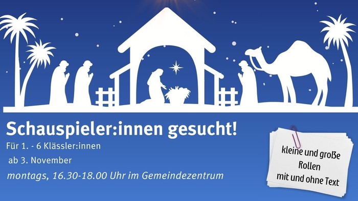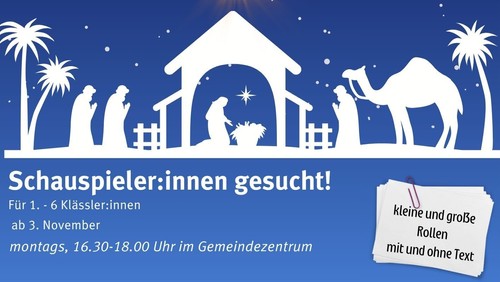 Am 24.12. um 14 Uhr wird es einen Weihnachtsgottesdienst mit Krippenspiel von Kindern (1.-6. Klasse) geben. Dazu suchen wir Schauspieler:innen, die Lust haben in eine kleine oder große Rolle mit oder ohne Text zu schlüpfen. Auch für Aufgaben „hinter“ der Bühne suchen wir Kinder.