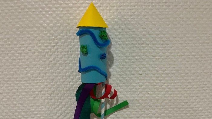 Heute gestalten wir aus Klopapierrollen phantasievolle Raketen.
